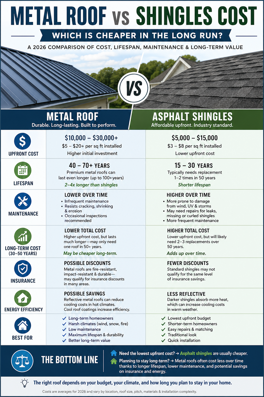 The smartest decision is not simply choosing the cheaper roof. It is choosing the roof that fits your budget, timeline, climate, and long-term plans.